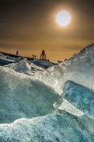 Kruiend ijs op de pier van Stavoren na de winter van 2012/2013 waarbij de schotsen zich opstapelen