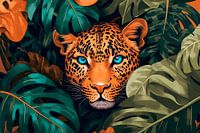 Te midden van weelderig groen gebladerte kijkt een majestueuze luipaard met felblauwe ogen naar buiten. Zijn opvallende, gevlekte vacht contrasteert levendig met de diepe vegetatie, terwijl de natuurlijke omgeving het mysterieuze karakter van de scène benadrukt. Deze harmonieuze eenheid van dier en natuur trekt de kijker direct de wildernis in.