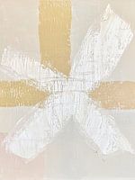 abstracte compositie met een groot, wit kruis dat prominent in het midden van het canvas staat. Het kruis lijkt handgeschilderd, met een grove textuur die de verfstreken zichtbaar maakt. Op de achtergrond zijn vier blokken in zacht beige en goudachtige tinten te zien, die het geheel een warme en gebalanceerde uitstraling geven. De verf is subtiel transparant aangebracht, wat een gelaagd effect creëert en diepte toevoegt aan het werk.