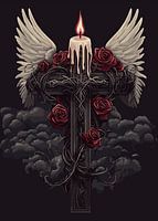 Het motief toont een donker houten kruis verstrengeld met doorntakken en dieprode rozen, die vergankelijkheid en passie symboliseren. Een brandende kaars met druipende was rust op het kruis en symboliseert licht en hoop te midden van de duisternis. Twee witte engelenvleugels flankeren het kruis en geven de afbeelding een spirituele, bijna hemelse uitstraling. Donkere wolken pakken zich samen op de achtergrond, wat bijdraagt aan de mystieke en melancholische sfeer van dit artistieke arrangement.