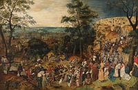 In een lange stoet wordt Christus voor zijn executie naar Golgotha geleid. Op de terechtstellingsplaats staat reeds een groep nieuwsgierigen te wachten wanneer daar de eerste ruiters van het escorte toekomen. Achter deze soldaten volgt een open kar waarin de goede en de slechte moordenaar meegevoerd worden, elk met zijn biechtvader naast zich. Daarachter volgt nog een groep lansknechten. Vervolgens komt Christus, die met de hulp van Simon de Cyrener zijn kruis voortsleept en omstuwd wordt door een hatelijke bende trekkende en sleurende beulen. Voor Hem knielt Veronica om met een sudarium zijn gelaat te betten. Achter Christus volgen, hoog gezeten op hun paarden, Pilatus en de hogepriester, die de terechtstelling moeten bijwonen. Vanop een rotsblok bij de rechter benedenhoek kijken Onze Lieve Vrouw, Johannes Evangelista en de Heilige Vrouwen wenend op de voorbijtrekkende stoet neer. Volgens Van Bastelaer en Hulin de Loo (1907) gaat de onderhavige compositie terug op een verloren origineel van de Oude Breugel. Terecht echter beschouwen Glück (1932) en Tolnay (1935) deze Kruisdraging als een originele compositie van Pieter de Jonge, hoewel in zeer hoge mate geïnspireerd door het gelijknamig werk van zijn vader in het Kunsthistorisches Museum, Wenen. Talrijke herhalingen, onder meer in de Galleria degli Uffizi, Florence, het Statens Museum for Konst, Kopenhagen, het Szepmüveszeti Muzeum, Budapest.