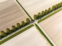 Kruispunt in een landelijk landschap in de Noordoostpolder in Flevoland, Nederland gezien van bovenaf tijdens een mooie lentedag. De Noordoostpolder is een polder in de voormalige Zuiderzee die in eerste instantie is ontworpen om meer water te creëren.