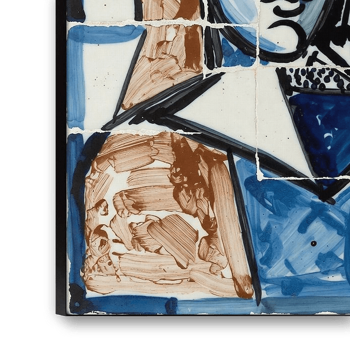 De fragmentatie en de rauwe, bijna kinderlijke expressie vangen de essentie van de moderne kunst. Het patroon van blauwe en witte kaders rond het portret zorgt voor een extra decoratieve laag.