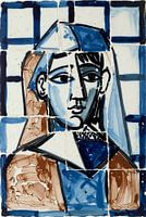 it krachtige en artistieke werk is een reproductie van een portret in de stijl van Pablo Picasso's kubisme, uitgevoerd op een raster van keramische tegels. De foto toont de abstracte, gefragmenteerde gelaatstrekken van de figuur, met kenmerkende dikke zwarte lijnen en scherpe hoeken, in een kleurenpalet dat gedomineerd wordt door blauw, wit en aarde-achtige bruintinten. Het tegelwerk is met de hand beschilderd, wat resulteert in zichtbare, dynamische penseelstreken en licht onregelmatige randen tussen de tegels, wat een charmante, ambachtelijke textuur toevoegt.