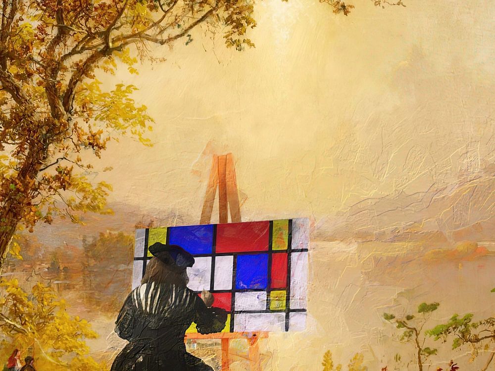 "Cubist Landscape" is een ware ode aan de natuur door de lens van moderne kunst! Deze gedurfde digitale collage mengt schilders' passie voor natuurlijke schoonheid met de creativiteit van de iconische kubistische schilder Mondriaan. Met een vleugje ironie en sarcasme parodieert dit werk de abstracte stijl van het kubisme terwijl het de uitbundigheid van Moeder Natuur viert. Wie zei dat moderne kunst en de natuur niet samen konden dansen in perfecte harmonie?