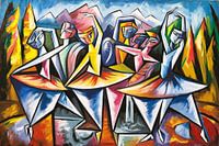 Dit kunstwerk toont een dynamische groep dansers in een levendige en kleurrijke omgeving. Met een duidelijke kubistische stijl worden de dansers weergegeven in hoekige, geometrische vormen die een gevoel van beweging en energie overbrengen. De achtergronden van bergen en bomen zijn op een abstracte manier geschilderd en contrasteren prachtig met de felle kleuren van de dansers. Dit schilderij is een visueel spektakel dat zowel modern als tijdloos aanvoelt. Het zou een opvallende aanvulling zijn in een eigentijdse ruimte, zoals een woonkamer of kantoor, waar het zowel energie als artistieke flair kan toevoegen.