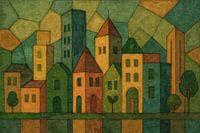 Een kubistisch stadspanorama dat zichzelf verliest in zijn eigen reflectie - als een droom die naar zichzelf kijkt. De geometrische huizen en bomen versmelten met een abstract landschap van heuvels en licht. Het warme kleurenpalet van groen, geel en oranje creëert een nostalgische sfeer.