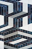 Dit beeld geeft een optisch bedrog. Het lijkt niet wat je ziet. Op het eerste gezicht zie je een kubus-achtige constructie. Afgewisseld met witte en donkerblauwe vlakken. Als je goed kijkt zie je ook nog andere horizontale en verticale lijnen.