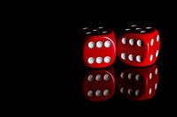 Twee rode kubussen op zwarte achtergrond met reflectie