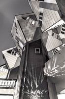 Avondopname van de door de architect Piet Blom ontworpen Kubuswoningen aan de Blaak in het centrum van de stad Rotterdam. Gelijksoortige Kubuswoningen zijn eveneens gebouwd in Helmond. De foto is gemaakt in het najaar van 2015. Versie in Zwart-wit licht gegranuleerd.