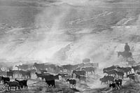 Een op een ezel rijdende herder met een kudde geiten en schapen in het droge en stoffige landschap van Oezbekistan.