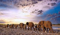 Kudde olifanten loopt de zonsondergang tegemoet, Namibië