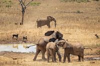 We hebben vier dagen doorgebracht op een onvergetelijke safari in Kenia. Drie dagen in de nationale parken Tsavo East en West en later in de Taita Hills. De parken waren zeer verschillend, terwijl Tsavo East bekend staat om zijn rode aarde, rode olifanten en steppe in een vlak landschap, heeft Tsavo West ook bergen met zware vegetatie, roofkatten en neushoorns. In de Taita Hills vind je een savanneachtig landschap met bergen op de achtergrond, ook mijn favoriet voor wildlife foto's. Bij de evenaar is het moeilijk fotograferen, vooral als je close-ups probeert te maken van wildlife zoals ik doe. De lichtomstandigheden veranderen snel en zijn ook heel anders. Dieren en voertuigen bewegen. Je moet dus snel zijn en werken met de belichtingstijden. Uiteindelijk ben ik er goed in geslaagd precies deze unieke sfeer van wilde dieren vast te leggen. Hier zie je een kleine kudde olifanten in het Keniaanse landschap.