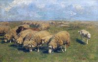 Een aantal ooien en één ram lopen door het open veld, terwijl de hond als herder aan het bewaken is in de vrije natuur. Het vee zit dik in de wol en de man van het gezelschap heeft grote hoorns.