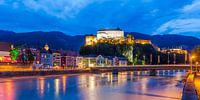 Stadsgezicht op Kufstein met de Innpromenade en de vesting Kufstein bij nacht.