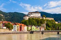 Panoramisch uitzicht over de Inn naar de oude stad en de vesting Kufstein, Kufstein, Tirol, Oostenrijk.