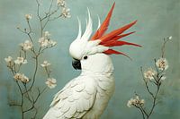 Een statige witte kaketoe met een speelse rood-witte kuif poseert zelfverzekerd tussen bloeiende takken. Haar zwarte snavel contrasteert prachtig met de zachte grijs-blauwe achtergrond, terwijl de bloesems een dromerig accent toevoegen. Een vogel met flair en een vleugje attitude!