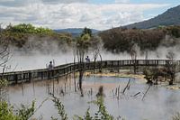 In het Kuirau Park in Rotorua in New Zealand vind je overal grote of kleine meertjes met veel thermische activiteit. Allerlei fossiele stoffen komen naar boven geborreld. Het ruikt naar zwavel en het is een prachtig gezicht!
