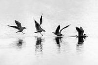 Zeemeeuwen worden denk ik niet gezien als de leukste en mooiste vogels. Toch kan ik ook door deze dieren verwonderd worden en heb ik deze sequence platen weten te schieten! Een artistieke weergave van een zeemeeuw die in het water land. In een zwart wit uitvoering.