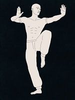 Minimalistische tekening van een Kung Fu vechter op een donkergrijze achtergrond.