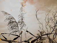 Natürliche Dekoration aus Schilf und Zweigen am See, digital kunstvoll gestaltet.