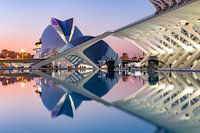 Terwijl de zon ondergaat in Valencia, wordt de Stad van Kunsten en Wetenschappen (Ciutat de les Arts i les Ciències) buitengewoon. De Stad van Kunsten en Wetenschappen is gebouwd in een voormalige rivierbedding van de rivier de Turia. Ontworpen door de Valenciaanse architect Calatrava.