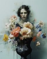 Kunst met een knipoog: een vaas met bloemen gecombineerd met een vintage portret, waardoor het haast lijkt alsof de vaas de kleding voor de vrouw vormt.