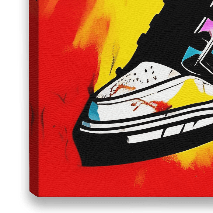 "Kunst op Kicks" is een enkelvoudige sneaker die in de schijnwerpers staat in dit kunstwerk dat doordrenkt is van kleurrijke popart en graffiti-invloeden. Deze compositie viert de schoen als een iconisch symbool van mode, zelfexpressie en urban cultuur.