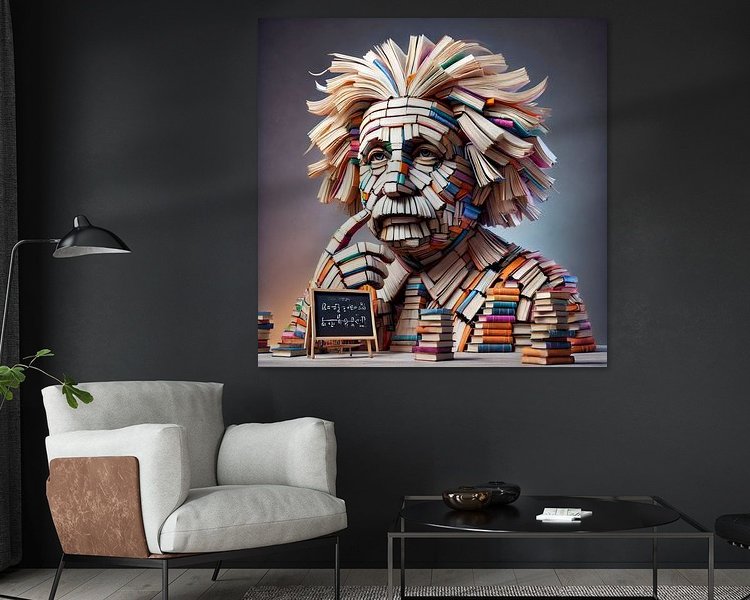 Deze fascinerende digitale poster combineert kunst, kennis en creativiteit op een unieke manier: De beroemde figuur van Albert Einstein, gevormd uit gestapelde en zorgvuldig gerangschikte boeken, wordt hier een symbool van intellect en inspiratie. De aandacht voor detail van het motief, in combinatie met de kleurrijke boekenruggen, geeft dit kunstwerk een onvergelijkbare diepte en dynamiek.