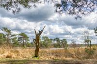 De stam van een dode boom op landgoed De Utrecht (Noord-Brabant) staat als een standbeeld in het prachtige landschap met de vele wolken en vormt zo een natuurlijk kunstobject.