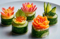 Een artistieke compositie die eetbare bloemen van sushi en verse groenten presenteert. De delicate kleuren van de bloeiende delicatessen, gecombineerd met de elegante vorm van de komkommerrolletjes, geven een creatieve en uitnodigende sfeer aan een keuken of eetkamer. Ideaal voor fijnproevers die van smaak en esthetiek houden!