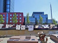 Tijdens 'Kunst aan de haven" hingen deze kunsthemden op historisch schip tegen de achtergrond van moderne architectuur aan de overzijde. Willemskade, Leeuwarden