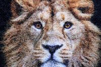 Foto van een mannelijke leeuwen kop met zijn manen, gemaakt van een geweven vloerkleed. De draden zorgen ervoor dat het een mozaïek lijkt.