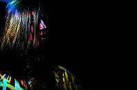 Deze foto toont een persoon gehuld in duisternis, met slechts delen van het gezicht en lichaam verlicht door kleurrijke reflecties. De combinatie van diepe schaduwen en felle tinten rood, blauw en geel op het gezicht en kleding geeft een dramatisch en bijna abstract effect.