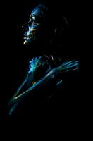 Deze foto toont een vrouw in een dramatische pose, gehuld in diepe schaduwen en mysterieuze verlichting. Haar gezicht en lichaam zijn bedekt met een verfachtige textuur in blauwe en gouden tinten, wat een etherische en bijna spirituele uitstraling geeft. De blauwe kleur lijkt haar huid te omhullen als een tweede laag, terwijl de subtiele gouden accenten haar gelaat en handen doen oplichten als een fonkelend element in de duisternis.