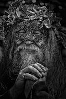 Deze zwart-witfoto toont een oudere man met een lange, wilde baard en lang haar. Hij draagt een masker gemaakt van mos en natuurlijke materialen, en een kroon van bladeren op zijn hoofd. Zijn handen zijn gevouwen, alsof hij bidt of in diepe contemplatie is. De gedetailleerde textuur van zijn gezicht, baard en handen wordt versterkt door…
