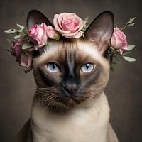 Kunstzinnige Kattenfotografie: Siamese Kat met Bloemenkrans van Vlindertuin-Art