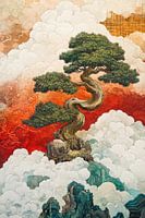 In het hart van de afbeelding siert een betoverende bonsai-boom de ruimte. Deze kunstzinnige boom lijkt te dansen op een wolkenkussen, omgeven door mysterieuze bergen die zich in de achtergrond verbergen. De delicate takken van de bonsai brengen een gevoel van rust, terwijl de wolken en bergen de diepte en schaal van de natuur oproepen.…