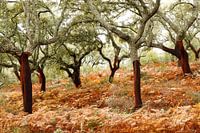 Kurkeiken bomen tussen herfstkleuren van de varens. In de hoger gelegen gebieden in Extremadura heb je een aantal gebieden met kurkeiken bomen. Een zeer intensief werk om het kurk te oogsten en kan slechts om de tien jaar plaats vinden. Niet zo gek dus dat kurk zo duur is.