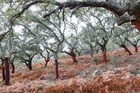 Kurkeiken bomen tussen herfstkleuren van de varens. In de hoger gelegen gebieden in Extremadura heb je een aantal gebieden met kurkeiken bomen. Een zeer intensief werk om het kurk te oogsten en kan slechts om de tien jaar plaats vinden. Niet zo gek dus dat kurk zo duur is.