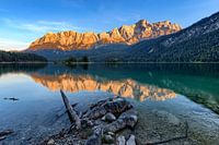 Blick über den Eibsee auf das Zugspitzmassiv kurz vor Sonnenuntergang.