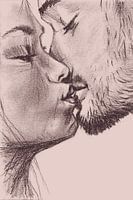 De Kus. Romantische potlood tekening man en vrouw kussend.