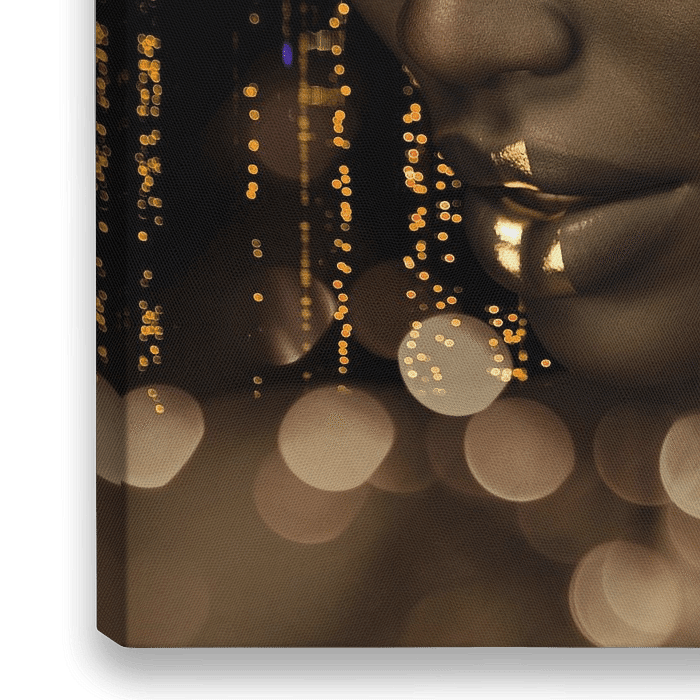 Blinkend met goud deze prachtige Afrikaanse jonge vrouw , een natuurlijke schoonheid in een studio vol gouden lichtjes.