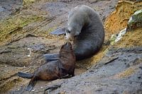 Kusjes voor mama van deze schattige kleine zeehondenpup. Dit soort taferelen waren overal te zien op deze geweldige locatie waar we naartoe werden gebracht met de Natures Wonders tour op Harington Point in de buurt van de stad Dunedin in Nieuw-Zeeland.