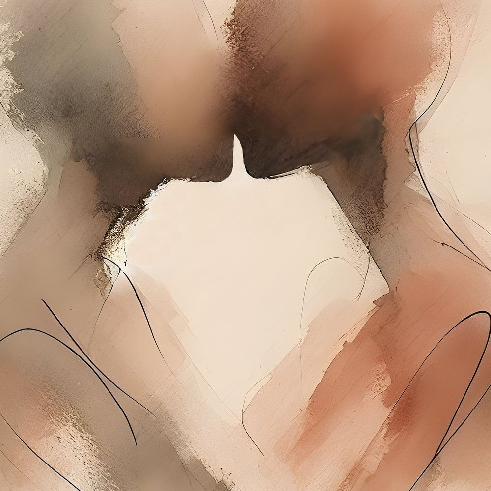 De kleuren bruin en roze dansen subtiel over het papier en vangen de tederheid van een kus.