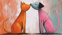 Kussende kat en hond abstract panorama schilderij is een speels en ontroerend kunstwerk dat de bijzondere vriendschap tussen twee geliefde dieren op een moderne en expressieve manier vastlegt. In dit schilderij worden de kat en hond weergegeven met vloeiende lijnen, zachte vormen en abstracte kleurvlakken. De dieren lijken elkaar teder te naderen of te kussen, waardoor het gevoel van verbondenheid, warmte en genegenheid direct voelbaar wordt.