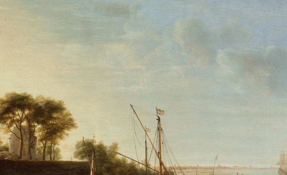 Een boot wordt aan wal gesleept door de Zuiderzee in Nederland. Verderop in de verte steken bosjes en een eenzame toren boven een muur achter de bootsteiger uit. Twee koffers (platbodemschepen) zijn afgemeerd aan de steiger, terwijl twee oorlogsschepen het meer opvaren. Vanachter de bomen valt goudkleurig licht naar buiten, dat de rustige blauwe lucht verlicht. Simon de Vlieger begon met het schilderen van taferelen op stormachtige zeeën. Onder invloed van Jan Porcellis zou hij er later naar streven de kalme en sfeervolle stemming vast te leggen die de windstille zeeën voor de kust van Nederland kenmerkt. De passieve lucht, de lage horizonlijn en de lichte kleuren werden terugkerende elementen in de Vlieger's late maritieme schilderijen.