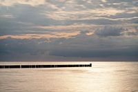Rustige strandshot van de Oostzeekust met een rij kribben die parallel aan de horizon lopen, het wateroppervlak wordt gladgestreken door langdurige belichting, lichtgrijze wolkenstructuren met gekleurd avondlicht.