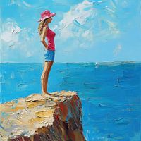 Kustkliffen Landschap | Silent Watcher on the Cliffs - Dit landschapsschilderij portretteert een eenzame figuur op een kustklif, uitkijkend over de uitgestrekte, rustige zee onder de levendige blauwe lucht.