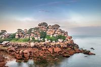 De kust van Ploumanac'h staat bekend om zijn roze rotsen. Overdag zie je die roze kleur niet. Pas bij avondlicht doen ze hun naam eer aan. De blauwe lucht geeft een mooi kleurcontrast. Een sluitertijd van 30 seconden zorgt ervoor dat het water mooi glad wordt.